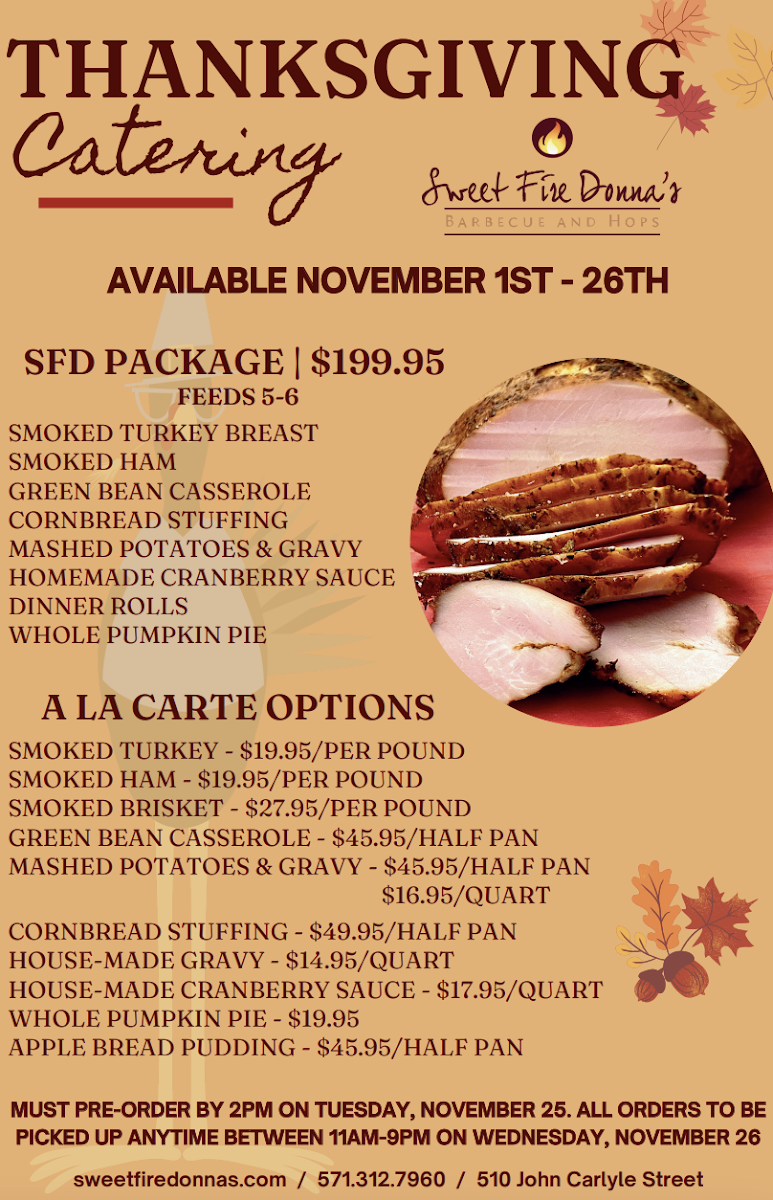 Sweet Fire Donna's serves up authentic barbecue in the heart of Alexandria, VA, blending tradition with bold flavors. Their menu highlights smoked meats like tender pulled pork, savory brisket sandwiches, and juicy turkey, each served on classic potato Kaiser rolls. For those craving variety, the Sweet Fire Sampler offers an indulgent mix of brisket, pulled pork, chicken, and pork spare ribs, paired with house-made sides and cornbread—perfect for sharing.